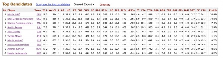BBR s latest MVP probability: Jokic 70.8% SGA 14.5% Doncic did not make the list due to insufficient games