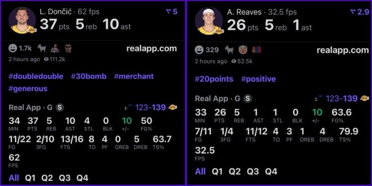 After the game, the Lakers self-media 𝐏𝐮𝐫𝐩𝑮𝒐𝒍𝒅 posted the statistics of Doncic and Reeves, and said: "It's so funny that they said James would drag them down."