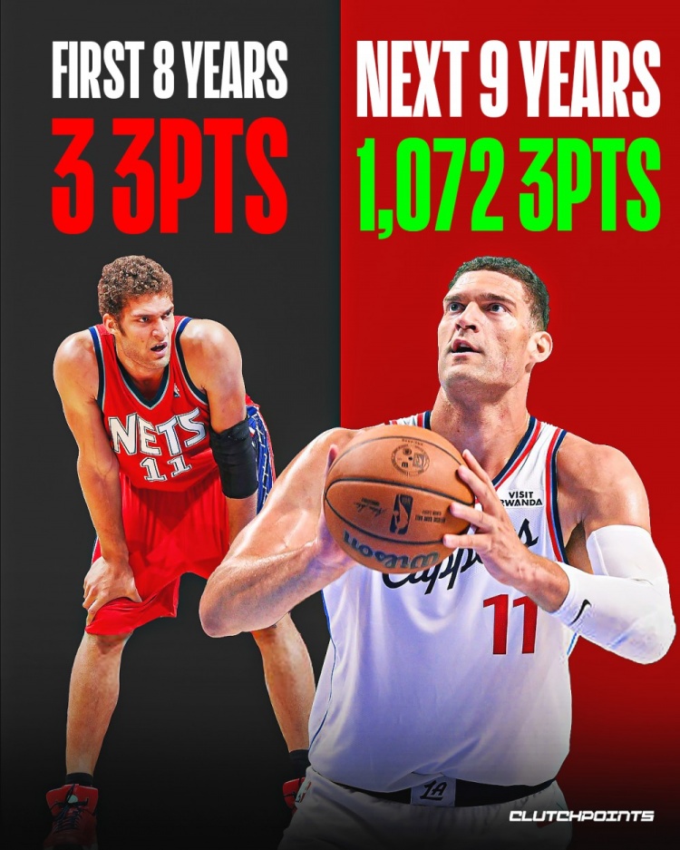 According to statistics, in the first eight seasons of his career, he made a total of 3 of 31 three-pointers. In the ninth season, the 16-17 season, he shot 134 out of 387. In the nine seasons from the 16-17 season to last season, he made a total of 1,072 of 3,024 three-pointers.