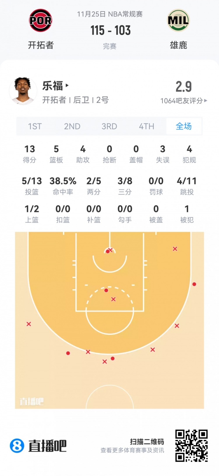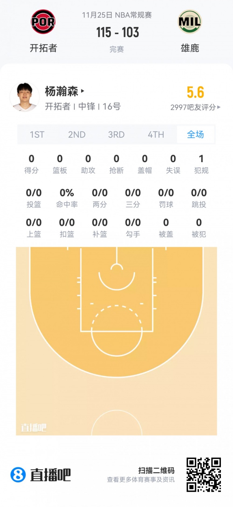 [Rookie] Yang Hansen played 2 minutes, Bailey scored 21 points, Flagg had 12 points and 7 rebounds, and Love scored 13 points on 13 shots.