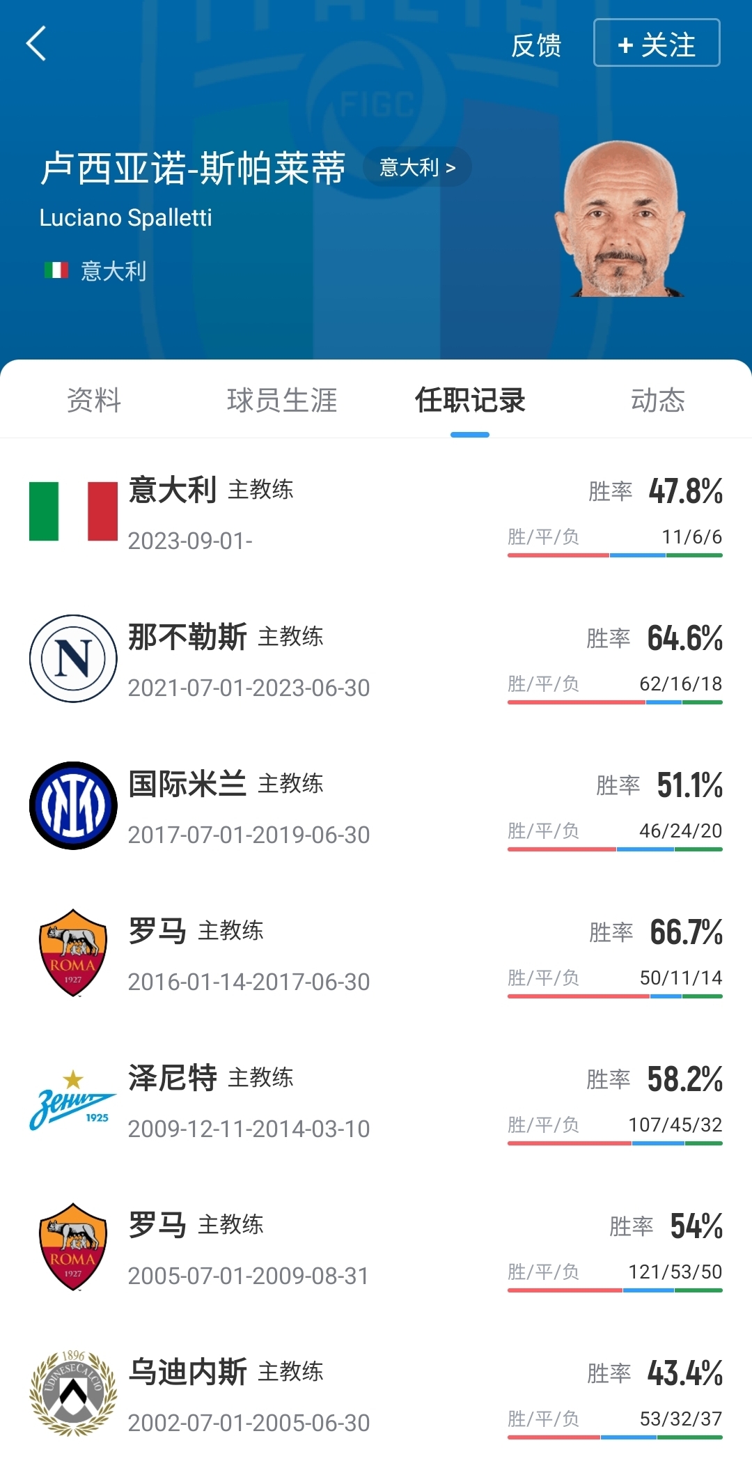 Sparetiti served as the head coach of the Italian national team in the summer of 2023, and has led the team 23 games so far, with a record of 11 wins, 6 draws and 6 losses. In the World Cup qualifiers in early June, the Italian team led by him lost 0-3 to Norway, and the prospect of advancement was cast in shadow.