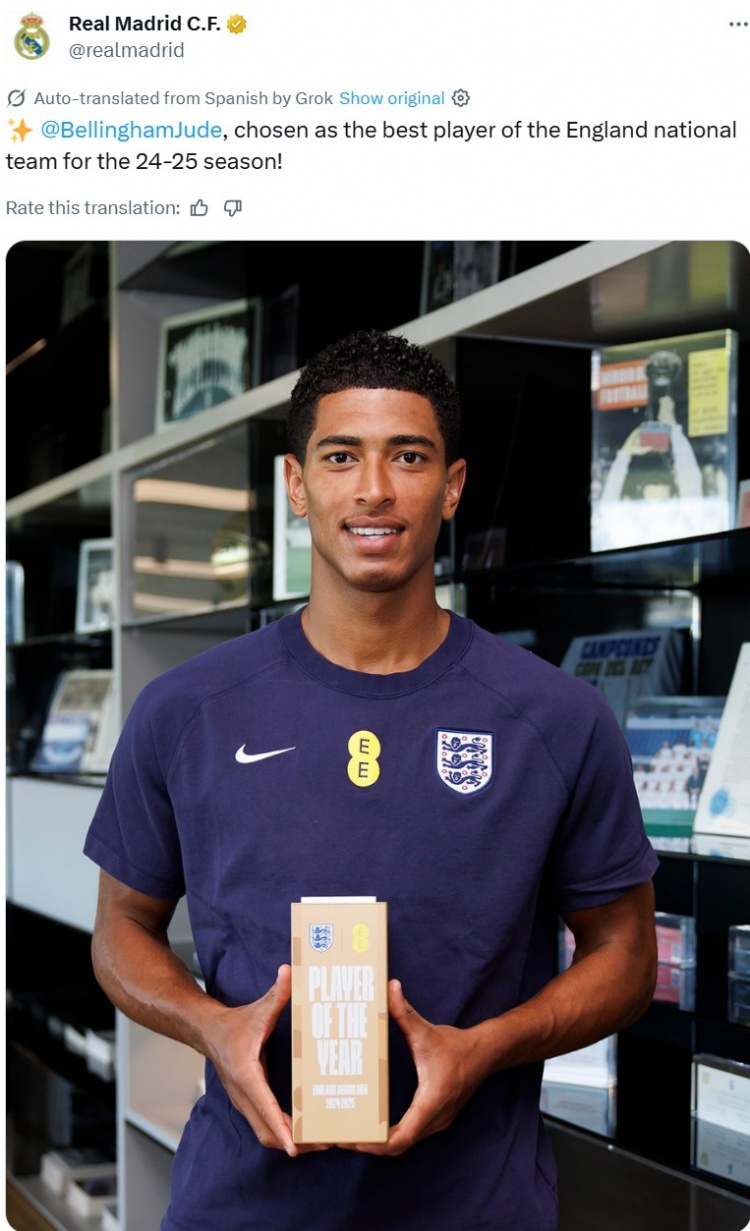 Bellingham was elected England's men's adult team player of the year in the 24/25 season, and Real Madrid's official promotion also posted photos to congratulate him.
