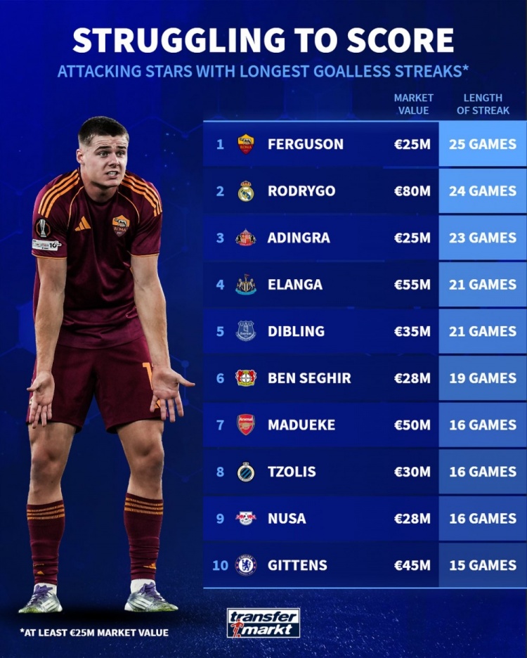 The German transfer market took stock of the number of games without scoring goals for offensive players and listed them. Evan Ferguson had 25 games and Rodrigo had 24 games.