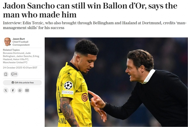 The British media "Daily Telegraph" interviewed former Dortmund coach Terzic and talked about many high-value players he had worked with. Regarding Sancho, Terzic said "he still has a chance to win the Ballon d'Or."
