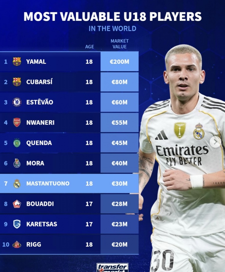 German transfer updated the world's U18 player value list, with Yamal ranking first with 200 million euros.