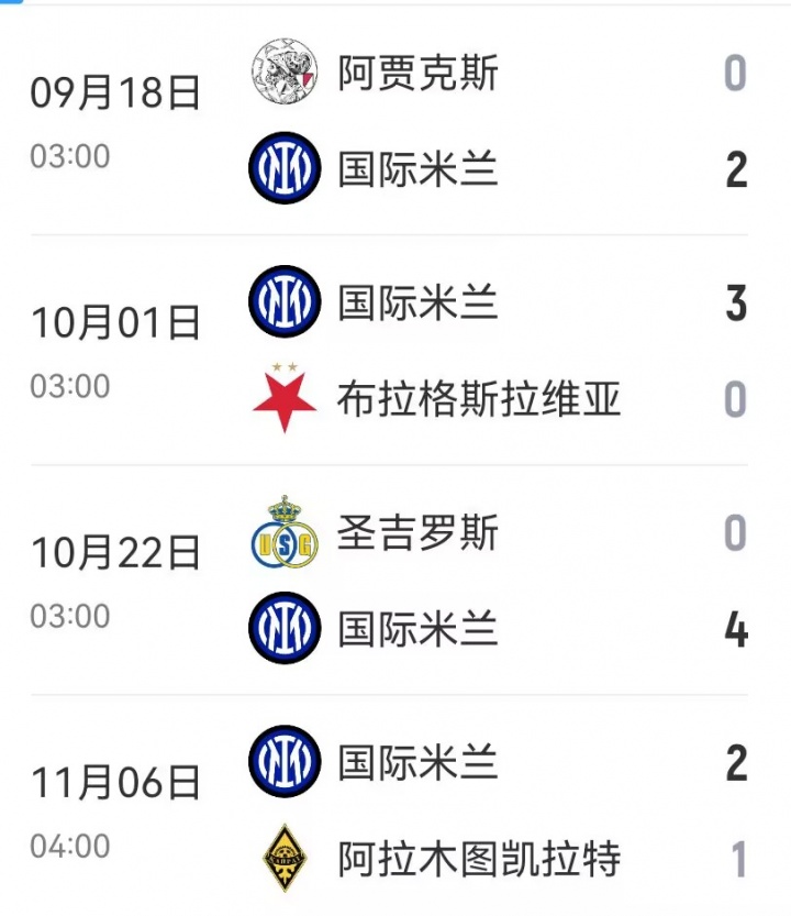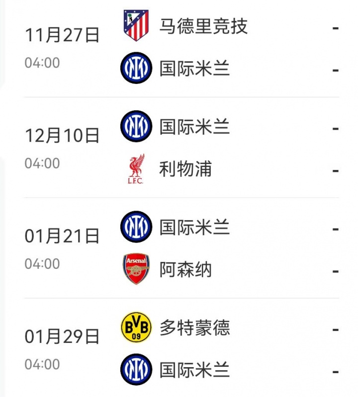 Although Inter Milan won the first four games in the first stage, the following Champions League schedule is extremely dangerous. In the second half of this stage, Inter Milan will play against Atletico Madrid, Liverpool, Arsenal and Dortmund. Among them, the game against Atletico Madrid (the 5th round) and the match against Dortmund (the final round) are away games.